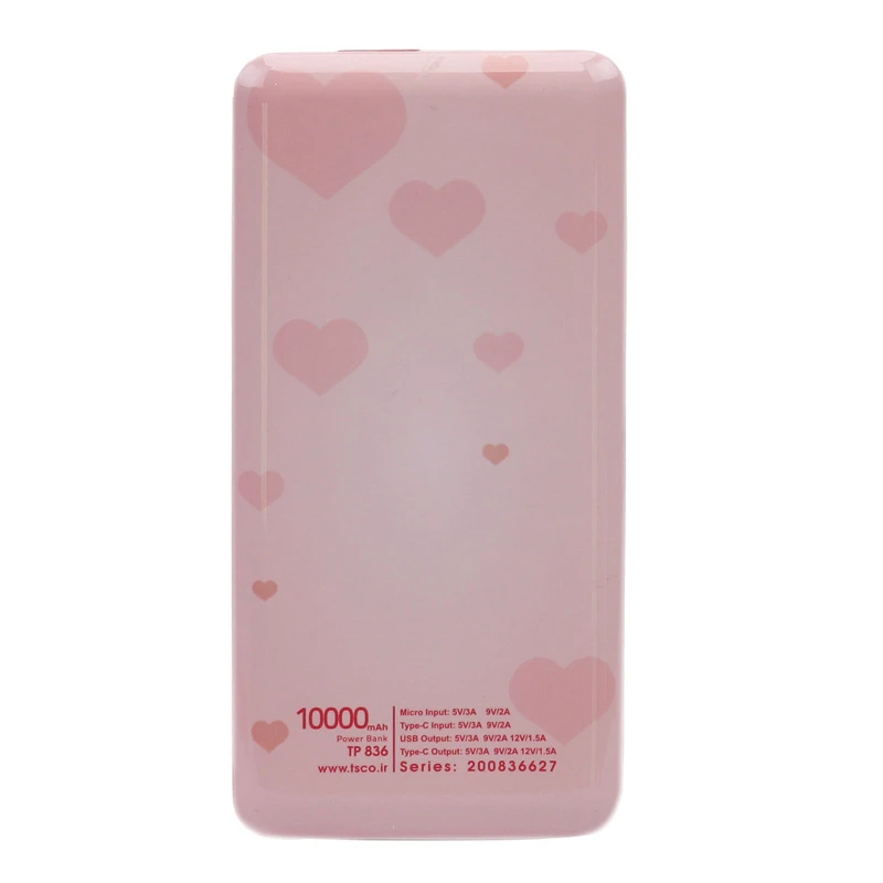 TP 836 پاوربانک طرح دار 10000 میلی آمپر از برند TSCO است که طراحی جذاب TP 836 فانتزی بوده و کیفیت بالای طرح های چاپ شده سبب ماندگاری بالای آن ها شده است. این محصول دارای ظرفیت 10000 میلی آمپری است و به شما امکان شارژ دو گوشی موبایل را به طور همزمان میدهد. همانطور که گفتیم بر روی TP 836 دو درگاه خروجی USB و Type-C وجود دارد که امکان اتصال و شارژ دو دستگاه مختلف بهطور همزمان با شدت جریان و ولتاژ 5V/3.0A,9V/2.0A,12V/1.5A را خواهد داشت.جنس بدنه این محصول از پلاستیک + ABS و متریال PC بوده که مقاومت بسیار بالایی در برابر ضربه ، فشار و حرارت دارد. این محصول با کیفیت و مقاوم، ایمنی فوقالعاده بالا و طراحی نسبتا سبک داشته و بهترین گزینه برای یک هدیه ماندگار است. ابعاد این محصول 15x70x143 میلیمتر و وزنی معادل 189 گرم دارد. همچنین LED نمایشگر آن نیز میتواند میزان شارژ باقی مانده ی پاور بانک را به کاربر نمایش دهد.