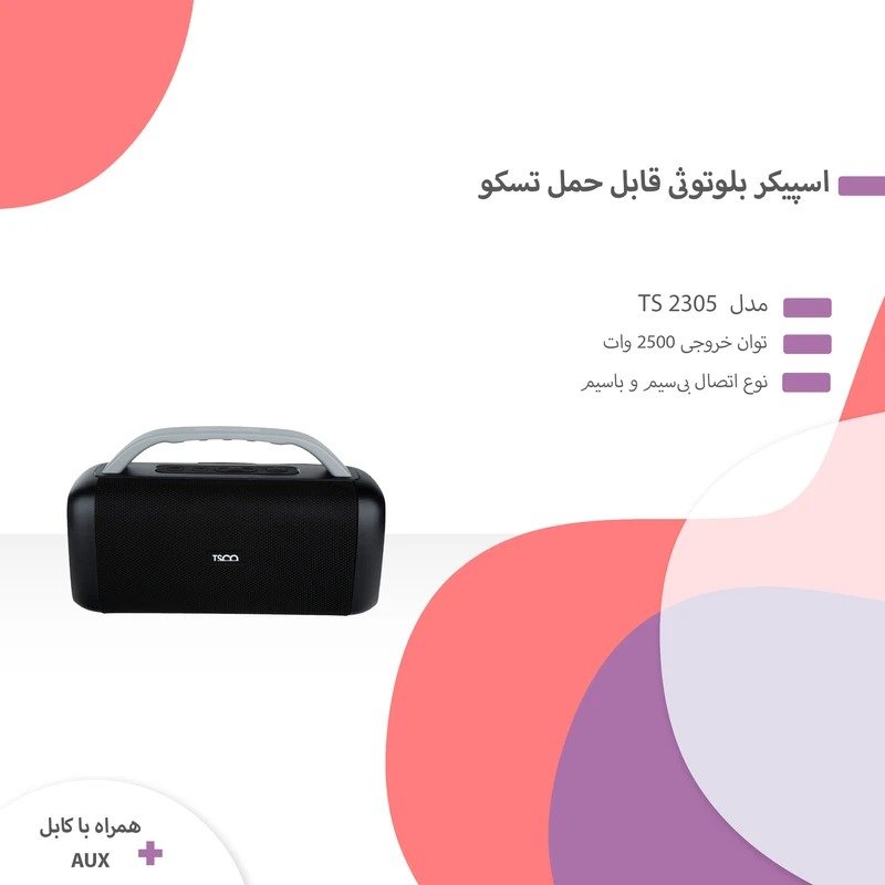 تجربهی صدای بینظیر را با اسپیکر بلوتوثی قابل حمل تسکو مدل TS 2305 از دست ندهید! با طراحی جذاب و کیفیت صدای فوقالعاده، این اسپیکر همراه همیشگی شما در سفرها و مهمانیها خواهد بود. باتری قدرتمند و اتصال بیسیم، لذت موسیقی را هر لحظه و هر جا برایتان به ارمغان میآورد. همین حالا خرید کنید و زندگیتان را موزیکال کنید!