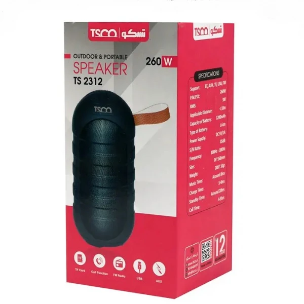 اسپیکر بلوتوث TS 2312 محصولی از برند تسکو است که با طراحی استوانه ای شکل تولید و ساخته میشود. TS 2312 برای استفاده در سفر و طبیعت، یا گردش آخر هفته مناسب خواهد بود. این اسپیکر تسکو مدل TS 2312 با بهره مندی از رابط های بلوتوث ، USB و TF CARD به منبع پخش متصل میشود و شما را در گوش کردن به موسیقی دلخواهتان یاری می کند . حداکثر توان خروجی اسپيکر 2312 تسکو 3 وات بوده که مقدار قابل قبولی برای يک اسپيکر قابل حمل است. همچنین بر روی بدنهی TS2312 کليدهايی جهت مديريت موسيقی مشاهده می شود که علاوه بر زیبایی سهولت استفاده از آن را دو چندان کرده است. این اسپيکر قابل حمل تسکو مدل «TS 2312» انرژی خود را از يک باتری داخلی 1200mAH تأمين میکند.